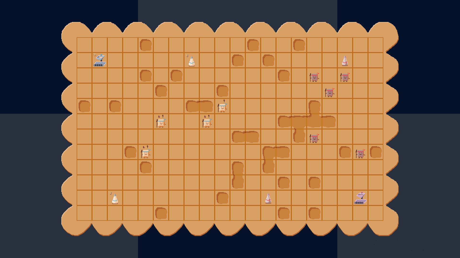 Blow holes in the battlefield and cut off enemy paths with your Cannon, and attack with your troops. Soldier units move and attack, but are made of biscuit dough, they can even sacrifice themselves to restore the giant biscuit map, if the price is worth paying.